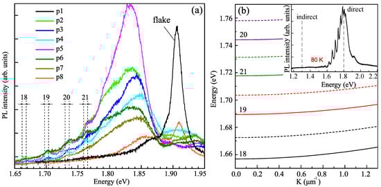 The intensity of the PL is maximal in the center of the NT, point p5 in Figure 1a, and decreases at the NT end. Analyzing the evolution of the spectra from point p5 to point p8 in Figure 2a, we can assume that the geometry of the NT is adiabatically changing as it becomes less like a NT and more like a ribbon (flattened tube). This is also confirmed by a decrease in the intensity of the peaks associated with the presence of optical modes and an increase in the intensity of the peak associated with the flat layer. It should be noted that NTs start to form inside microfolds or bend the edges of curved flakes [2]. To put a NT on the SiO substrate, one should tear it from the silica ampoules, where the NTs are grown. The point p8 corresponds to the tip of the NT, which consists of a chunk of the flake and the incipient part of the NT. Thus, due to the limited spatial resolution, we observe PL contributions from both the NT and the flake, which have approximately the same thickness. The other end of the tube (points p2–p4) turns out to be undamaged, as we observe pronounced optical modes in the corresponding spectra. In addition, we show the TM-polarized micro-PL spectrum measured at low temperatures where the peaks corresponding to the WGMs are more pronounced (see the inset in Figure 2b).