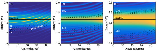 To show the effect of a light-exciton interaction, we calculate the PL spectra each as a function of detection angle for different values of the Rabi splitting; see Figure 3. In the regime of weak interactions (see panel (a) for meV) the PL spectra consists of the peaks corresponding to the optical modes with different angular numbers m. The intensities of the peaks grow when they approach exciton resonance energy, but their energies (dashed lines) remain unperturbed. The increase of the light-exciton interaction strength leads to appearance of a series of anti-crossings, each of them reflecting the interaction of an optical mode and the excitonic mode with the same angular quantum number m; see panels (b) and (c) calculated for and 200 meV, corresponding to the variation of the radiative lifetime in Table 1. The modes with different m, which were degenerate in the absence of interaction, are now split into upper and lower polariton modes, and a broad peak at the exciton frequency appears between them. Therefore, the first signature of exciton-polaritons formation is the widening of the major PL peak.