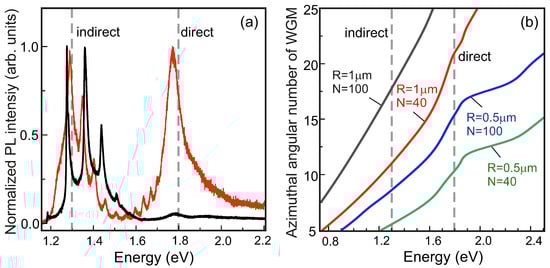 We have predicted the possibility of strong coupling between light and excitons in high-quality NTs with low inhomogeneous broadening. However, the condition of high quality is necessary but not the only one that needs to be taken into account. The WGM peaks can appear either in the spectral range of indirect exciton, which is useless for polaritonic application, or can extend up to the range of a direct exciton, which can have strong oscillator strength even at room temperatures (see Figure 4a). This is because only the modes with the azimuthal angular numbers of 20 possess sufficient quality (Q) factor. Our calculations (Figure 4b) show that such WGMs definitely appear in the spectral range of interest when the tube has a radius around 1 m and a wall width more than 40 monolayers. The nanotubes with smaller radii, even if they have thicker walls, are characterized by lower Q-factor. Indeed, we never observed the WGM peaks in the spectra of such NTs in our experiments.