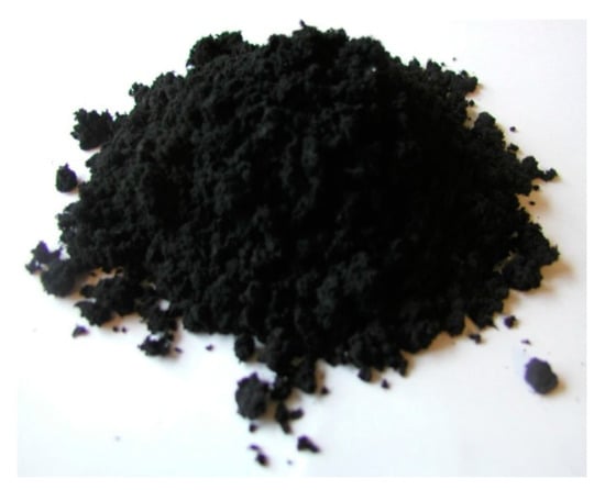MWCNTs were synthesized by the MOCVD method with pyrolysis of ferrocene and toluene mixtures in an argon flow (flow rate 500 cm3/min) at atmospheric pressure in a tubular quartz reactor in accordance with the procedure outlined in []. The MWCNT synthesis method and labware scheme are presented in Supplementary Figure S1. Figure 1 shows a photograph of MWCNTs in the form of a powder, which was obtained by grinding macrocylinders. Grinding was carried out in a rotary-type disperser (Stegler, Moscow, Russia) with a knife rotation speed of ~400 rpm. The prepared nanocomposite of the MWCNTs coated with a layer of pyrolytic chromium (Cr/MWCNT) was stored in a volume filled with high-purity argon.