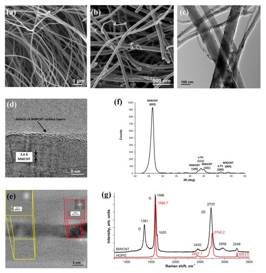 The initial MWCNTs research results: (a,b) scanning electron microscope (SEM) images of initial MWCNTs; (c) transmission electron microscope (TEM) image of MWCNTs; (d,e) high-resolution TEM (HRTEM) images of a γ-Fe-filled nanotube with inserts of FFT (fast Fourier transform) which show the carbon interplanar spacing 0.34 nm and the crystallinity of the filling (γ-Fe interplanar spacing 0.198 nm); (f) X-ray powder diffraction pattern of initial MWCNTs; (g) Raman spectra of MWCNT and HOPG.