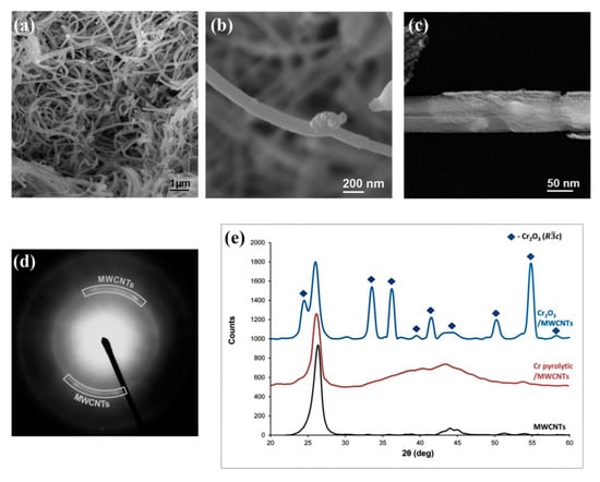 The Cr/MWCNTs nanocomposite research results: (a,b) SEM and (c) TEM micrographs of the Cr/MWCNTs nanocomposite; (d) selected area electron diffraction (SAED) image of the Cr/MWCNTs nanocomposite; (e) X-ray diffraction (XRD) patterns of the initial MWCNTs (black), the Cr/MWCNTs hybrid material (red), and the Cr/MWCNTs hybrid material after annealing at 400 °C in air (blue).