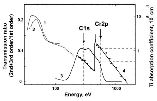 Dependences of the ratio of the higher orders X-ray radiation intensity (2 and 3 orders of magnitude) to the X-ray radiation intensity of the 1st diffraction order for the 1200 lines/mm grating and Cff = 2.25 [] (3), and the spectral dependences of the metallic Ti linear absorption coefficient in a wide energy range. Dots and a solid line indicate the results of measurements on X-ray emission lines [,] (4), dotted line shows the data in the vacuum ultraviolet area (1) [], (2) []. The arrows indicate the C1s (285 eV) and Cr2p (570 eV) absorption edges positions.