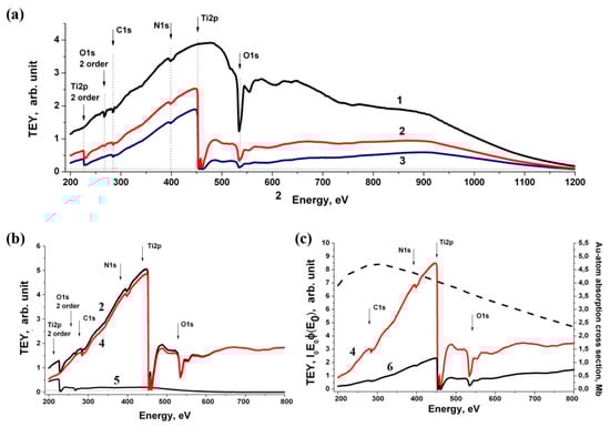 Total electron yield (TEY) signal and I0E0j(E0) spectral dependences of pure gold: (a) the TEY signal obtained from the surface of pure gold without a filter (1) and using Ti filters with a thickness of 150 nm (2) and 230 nm (3). Vertical lines show the Ti2p, O1s, and N1s absorption edges in the first and second orders of reflection from the diffraction grating; dashed horizontal line is the level of the scattered long-wave background; (b) spectral dependences of the measured TEY signal (2), monochromatized TEY signal (4) and second-order radiation (5) on the pure gold surface using 150 nm Ti filter. The arrows indicate the absorption edges in the first and second diffraction orders; (c) spectral dependences of the TEY monochromatic signal on the Au plate with a 150 nm Ti filter (4), I0E0j(E0) (6) and the absorption cross section of the gold atom [] (dashed line) in Mb (right scale).