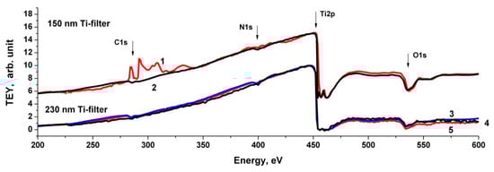 Figure 8b shows the sequence of taking into account the contribution of this radiation, which was carried out in two stages. At the first stage, the filtration coefficient β of short-wavelength radiation was determined when SR was reflected at sliding angles from the surfaces of the monochromator optical elements, which was equal to the ratio of the absorption surges in the Ti2p edge region in the first (454 eV) and second-order (227 eV) diffraction. At the next stage, the radiation spectral dependence of multiple orders of magnitude was determined by dividing the measured TEY signal in the region of 400–1000 eV by β, followed by its transfer to the long-wavelength spectral region after a decrease in the energy scale by a factor of 2. The Figure 8b shows that the dependence YAu (curve 2), after subtracting the background contributions from the TEY signal, becomes monotonic in the regions of 225 eV (Ti2p edge second order) and 265 eV (O1s edge second order) (curve 4), this indicates the correct background radiation accounting.