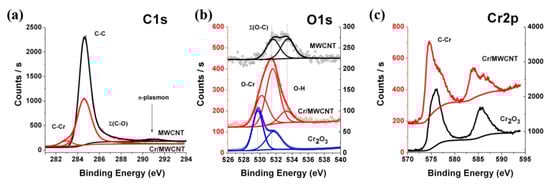 A more accurate method for determining thickness is XPS. Thickness can be obtained from the change in the XPS C1s peak intensity for MWCNTs compared to nanocomposites. The peak intensity is determined by the yeild of C1s photoelectrons with certain energy equal to the difference between the incident X-ray radiation energy and the C1s electron-binding energy. In the present work, this energy was 1202 eV. Survey photoelectron spectra are given in Supplementary Figure S5. Figure 11a–c and Figure S6a–c (in Supplementary Materials) show the C1s, O1s, Cr2p, and Fe2p photoelectron spectra of MWCNTs, Cr/MWCNTs, and Fe/MWCNTs. An analysis of the initial MWCNTs spectra shows that the C1s spectrum agrees well with other studies’ data [,,,,] at the binding energy of the main peak (284.5 eV) corresponding to the C–C bond and at the wide plasmon band (291 eV), which confirms the high quality of MWCNTs under study. However, in the structure of the O1s spectra of MWCNTs (Figure 11b), two peaks with binding energies of 531.7 eV and 533.5 eV (correspond to the energies of C=O and C–OH bonds, respectively [,]) are found. The relative content of oxygen and carbon atoms, determined from a comparison of the integrated peak intensities in the C1s and O1s spectra of MWCNTs, is no more than 3%, which is consistent with Raman and NEXAFS spectroscopy data and demonstrates a very low oxidation state of the nanotubes’ outer surface. Figure 11a,c show the XPS O1s and Cr2p spectra of Cr2O3 oxide and the Cr/MWCNTs nanocomposite. Both spectra have a common structure in the form of peaks with energies of 575.8 eV and 585.6 eV in the Cr2p spectra and 530.2 eV and 531.6 eV in the O1s spectra. This is consistent with the NEXAFS Cr2p absorption spectrum data and confirms that the coating consists of chromium trioxide Cr2O3. From the ratio of the C–C bond main peaks’ areas in the spectra of the initial nanotube and Cr/MWCNT nanocomposite S1/S2 = 1.9, the effective thickness of the chromium oxide coating layer were determined to be deff = 1.5 nm. In this case, the mean free path of photoelectrons with an energy of 1202 eV in Cr2O3 λ = 2.33 nm []. The effective thickness obtained by XPS is in good agreement with NEXAFS measurements.
