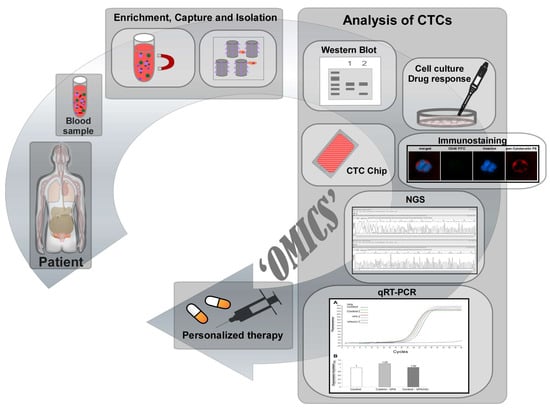 Overview of CTCs analysis of patients-derived CTCs including drug resistance detection and personalized therapy: Patients’ blood sample is screened and potential CTCs are captured and isolated by different isolation methods. Potential CTCs can be determined and used for further analysis to develop personalized medicine.