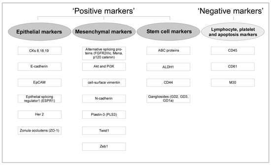 The process of EMT is important for the initiation of a stem cell phenotype which displays some characteristics. During the metastasizing process developed characteristics such as high invasiveness, self-renewal ability and resistance to apoptosis and therapy, are used as biomarkers for detection and isolation of CTCs [39,40]. Specific biomarkers are essential for most biological detection methods. Cancer biomarkers are the measurable molecular changes between normal and cancerous tissues of patients. Each cancer type has specific pathological evolution and molecular characteristics. Consequently, for further applications in CTC capture and isolation the identification of these biomarkers is crucial [41,42]. For example, CTCs are commonly described to express epithelial markers like EpCAM and cytokeratins (CKs), and to be nucleated (identified by staining with a nuclear dye such as DAPI, 4′, 6-diamidino-2-phenylindole). Moreover, CTCs do not express cell surface marker CD45 which is specific for white blood cells [43,44,45,46]. In summary, it can be declared that positive results in CTC specific detection can be obtained by using a variety of epithelial-, mesenchymal-, and stem cell markers. Additionally, in order to determine and eliminate debatable cells ‘negative markers’ could be used for CTC detection. These markers include for example platelet marker CD61, CD45 and apoptosis marker M30 [43,44,45,46]. Some of these key biomarkers are illustrated in Figure 2.