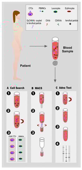 Another method using more than one antibody for the magnetic enrichment of CTCs is the AdnaTest (AdnaGen AG, Langenhagen, Germany). AdnaTest allows the immunomagnetic enrichment of CTCs via epithelial and tumor-specific antigens (Figure 3C) by making use of different magnetic microbeads, such as the superparamagnetic DynaBeads. This mixture of magnetic beads is simultaneously conjugated to antibodies against EpCAM and tumor-associated antigens for labeling of CTCs in peripheral blood. Next, labeled cells are lysed, mRNA is extracted from captured cells and transcribed into cDNA. The analysis of the CTC gene expression can be made by a multiplex polymerase chain reaction (PCR) [66,67]. In comparison to CellSearch, AdnaTest exhibits improved enrichment efficiency due to the usage of two antibodies and the size of magnetic particles.