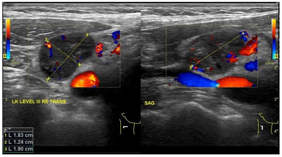 Ultrasound images of right transverse lymph node level III. Lymph node demonstrates malignant characteristics: axes are larger than 1 cm (left image), round shape with necrotic areas (right image).