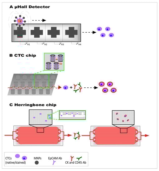 Design of microfluidic chips for CTC detection. Whole blood sample is pushed through the surface of the chip. (A) Cells are MNPs-immunolabeled and can be detected via monitoring the magnetic moments of cells in-flow on µHall detection chip. (B) CTC chip is coated with a CTC-specific antibody, such as EpCAM, and contains Ab-coated microposts. This system is also used in herringbone chip that contains Ab-coated microchannels (C). Captured cells are stained for CK, CD45 and DAPI for identification and enumeration.