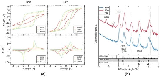 The electrical measurements of the MFM samples show for both HSO and HZO that an initially pinched P–V loop (see Figure 1a) and thus a anti-ferroelectric-like behavior. With cycling, the loops become more ferroelectric, as can be seen from the resulting merged peaks in the corresponding current–voltage (I–V) loops. This behavior is called wake-up effect.