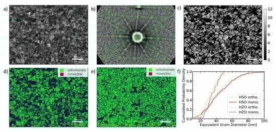 For given crystal structures, in this case the orthorhombic and monoclinic phase of HfO2, the expected Kikuchi patterns can be simulated and fitted to the measured ones (see Figure 2b). From the amount of indexed lines, the trust in each fit can be estimated and visualized (see Figure 2c). By color coding the fitted phases, the crystallographic phase distribution of the microstructure can be visualized as shown for HSO and HZO in Figure 2d,e, respectively. It should be noted here that the tetragonal and cubic phases were not taken into account, since their Kikuchi patterns are quite similar, thus rendering a fit to distinguish these phases much more difficult. Therefore, some tetragonal or cubic grains will be indexed as orthorhombic in the fit.