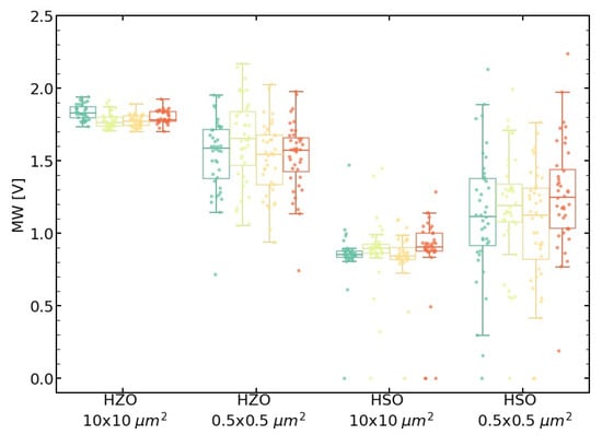 Regarding the influences of the microstructure difference between HSO and HZO on integrated devices, the in-die variability of the memory window was investigated for two device layouts (see Figure 4). For HSO and HZO FeFETs, the larger device (10 × 10 μm2) shows a smaller variability. In the case of the small devices (0.5 × 0.5 μm2), broken FeFETs also appear with a memory window close to zero. Furthermore, the HSO shows a larger MW distribution than HZO.