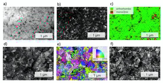 From the visualization of the indexed phases (see Figure 5c), it is apparent that the orthorhombic phase is predominant, but some monoclinic grains are still remaining. The crystallographic phase fitting quality is visualized in Figure 5d. In this sample, only weak texture can be observed (see Figure 5e and corresponding fit reliability in Figure 5f).