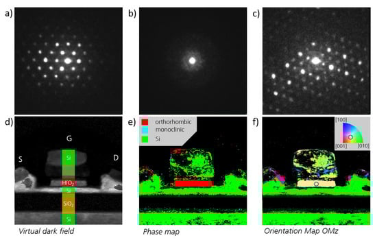 (a–c) display the measured diffraction pattern for measurement points from the silicon, silicon oxide, and hafnium oxide region, respectively; (d) shows the dark field of the cross-section of a 22 nm FDSOI FeFET. The phase map is shown in (e), showing predominantly orthorhombic HfO2. The crystallographic axis parallel to the gate stack is visualized in (f) indicating an orientation close to [111].