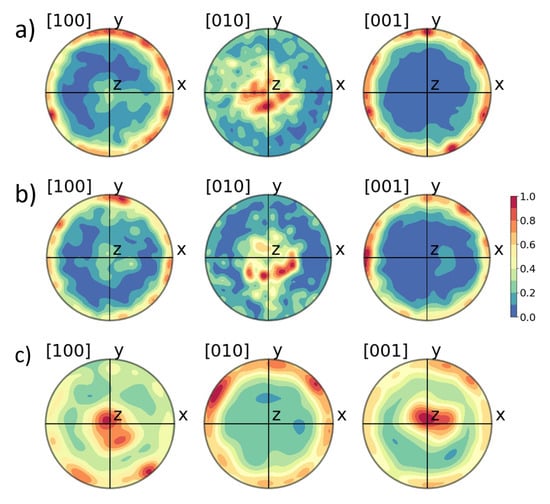 In the case of the monoclinic phase, the GIXRD emphasized a [100] texture. From the pole figures in Figure 7c, a preferred orientation of the <100>-axes either close to the in-plane or out-of-plane directions is apparent. Only a few measurement points showed an orientation around 45° to the sample plane, thus agreeing with the low intensity of the diffraction lines at around 25° or 30°.