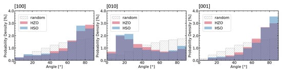 TKD and GIXRD as well as electrical measurements suggested a strong out-of-plane texture of the [010]-axis or even a preferred crystallographic orientation for the orthorhombic grains inside the HSO layer. This can also be seen in the pole figures (see Figure 7a). The pole figures of the HZO layer (see Figure 7b), as well as previously reported TKD analysis of the HZO film [], have shown a similar texture. In order to compare the orientation of these two differently doped thin films, the distribution of the angle between the [001]-, [010]-, and [001]-axes and the thin film normal are extracted from the crystallographic orientation maps (Figure 3) of the doped hafnium oxide layers and compared in Figure 8. The texture of both films appear here very clearly in comparison to the simulated angle distribution for randomly oriented grains. While the [010]-axis favors an orientation parallel to the sample normal, the other two axes lie favorably in-plane. Furthermore, this texture is more strongly pronounced in the HSO sample for all directions.