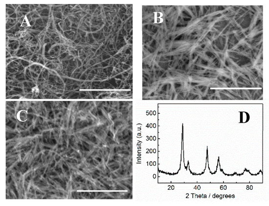 Scanning electron microscope (SEM) images of MWCNTs (A), CeO2 nanorods (B), and MWCNTs-CeO2 nanorods (C). Scale bar: 1.0 μm. The XRD of CeO2 nanorods (D).