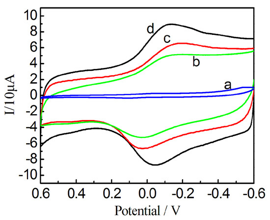 Figure 2 shows several scans of cyclic voltammetry (CV) recorded on 10−6 mol/L RIF in 0.1 M PBS (pH = 7.0) at different electrodes material: bare GCE (a), CeO2 nanorods/GCE (b), MWCNTs/GCE (c), and MWCNTs-CeO2 nanorods/GCE (d). Bare GCE shows virtually no redox activity for RIF as the CV scan does not show a peak pair in curve 2-a. By modifying the electrode with MWCNTs and CeO2 nanorods, the peaks for the reversible oxidation and reduction of RIF appears, which is evidence of the enhancement on the activity. For CeO2 nanorods/GCE and MWCNTs/GCE, the oxidation peak appears ca. −0.1 V vs. SCE followed by a reduction peak ca. 0.05 V vs. SCE in the reverse scan. The peak currents are further increased on MWCNTs-CeO2 nanorods /GCE (curve 2-d). In this case, it is also seen a shift in the peak potential to more negative values. This may be due to: (1) MWCNTs and CeO2 nanorods have large area which can increase the effective surface area of the electrode, which yield to more activation sites for the reaction of RIF, (2) MWCNTs with good electrical conductivity can improve the electron transfer ability of the electrode; (3) CeO2 nanorods can increase the adsorption amount of RIF on the modified electrode surface due to its ability to bind to oxygen-rich groups, which could improve the detection signal as well.