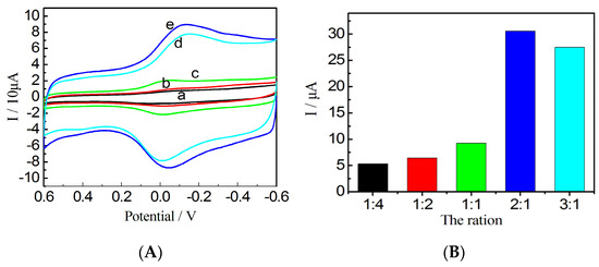 (A) CVs of the electrode modified with different ratio of MWCNTs/CeO2 nanorods: 1:4 (a); 1:2 (b); 1:1 (c); 2:1 (e); 3:1 (d). (B) The relationship between the reduction peak current and the ratio of MWCNTs/CeO2 nanorods.