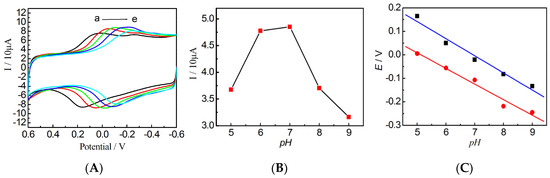 (A) CVs of RIF at the MWCNTs-CeO2 nanorods/GCE in 0.1 M PBS with different pH (a—5.0, b—6.0, c—7.0, d—8.0, e—9.0); (B) The relationship between the reduction peak current and pH; (C) The relationship between the peak potential and pH (The reduction peak potential (blue) and The oxidation peak potential (red)). Scan rate: 0.10 V/s.