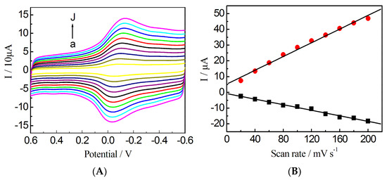 (A) CVs of RIF at the MWCNTs-CeO2 nanorods/GCE at the different scan rates in 0.1 mol/L PBS (a—0.02 V/s, b—0.04 V/s, c—0.06 V/s, d—0.08 V/s, e—0.10 V/s, f—0.12 V/s, g—0.14 V/s, h—0.16 V/s, i—0.18 V/s, j—0.20 V/s). (B) The relationship between the redox peak currents and scan rate.