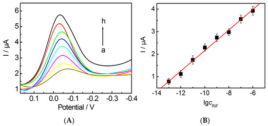 (A) DPVs of the different concentrations of RIF at MWCNTs-CeO2 nanorods/GCE in 0.1 mol/L PBS (pH = 7.0); (B) The reduction peak current vs. the concentration of RIF. a—1.0 × 10−13, b—1.0 × 10−12, c—1.0 × 10−11, d—1.0 × 10−10, e—1.0 × 10−9, f—1.0 × 10−8, g—1.0 × 10−7, h—1.0 × 10−6 mol/L.