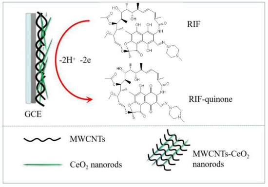 Herein, a “nanonetwork” modified electrode was fabricated based on MWCNTs and CeO2 nanorods, and employed to detect RIF. The electrochemical behavior and reaction mechanism of RIF at this modified electrode surface was studied. The experiment results imply that the proposed electrode have obvious electrocatalytic ability for the redox of RIF. Additionally, the proposed method has high sensitivity and selectivity, and has been successfully applied for detecting RIF in complex samples, thus demonstrating its potential application in the assay of RIF in biological and pharmaceutical samples.
