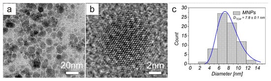 (a) TEM and (b) high resolution transmission electron microscope (HRTEM) images of MNPs. (c) TEM size distribution obtained from TEM images of MNPs.