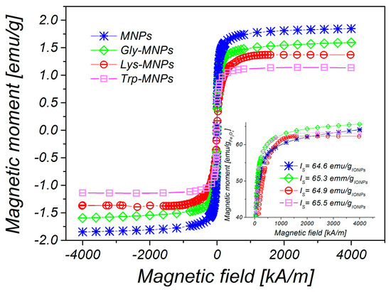 Magnetisation curves of uncoated MNPs, Gly-, Lys- and Trp-magnetic nanoparticles (MNPs) with concentration c = 25 mg iron oxide nanoparticles (IONPs)/mL. Inset: recalculated saturation magnetization of the samples on emu/gIONPs.