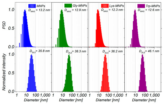 The particle size distribution of magnetic cores obtained from magnetic measurements (upper row), and the size distribution of MNPs, Gly-MNPs, Lys-MNPs, and Trp-MNPs obtained by dynamic light scattering (DLS) technique (lower row).