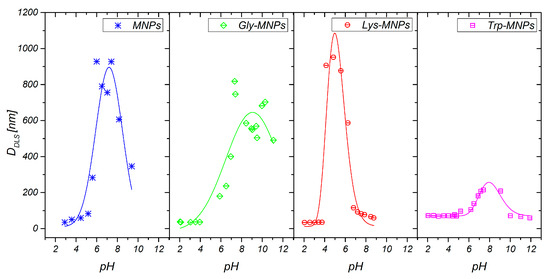 The DLS method was used to characterise the MNPs and AA–MNP colloid suspensions, from which the samples for microscopy were prepared. This technique is very different from the imaging of dried samples and is sensitive to dynamic aggregation, agglomeration, and so forth. Furthermore, the DLS technique allows the calculation of the hydrodynamic size of MNPs indirectly through the determination of the frequency of movement and modeling of the size from this data. Thus, one can expect different results from this technique compared to the data from microscopic ones. Despite this, the size distributions of the MNPs coated with Gly, Lys, and Trp measured by the DLS were very similar to the SEM results. The mean hydrodynamic diameters (DDLS) of the prepared samples were 35.8 ± 0.3, 38.3 ± 0.3, 36.2 ± 0.4, and 46.1 ± 0.4 nm for the MNPs, Gly-MNPs, Lys-MNPs, and Trp-MNPs, respectively. The measured hydrodynamic size corresponds to the inorganic NP core with the surface layer that moves in the suspension, whereas the TEM only measures the inorganic core size [31]. Furthermore, the zeta potential measurements (conducted at pH ranging from 3.6 to 4.6, see Table 2) show that in the absence of AA, the zeta potential of MNPs was approximately + 30 mV. This value increased in the presence of AA, suggesting that at least part of the AA was surface-adsorbed (see Table 2). The zeta potential is also a crucial parameter in determining the stability of colloid suspension systems. While the measured values of the AA–MNP samples were above the + 30 mV value in the pH range from 2 to 4, indicating good colloidal stability, Lys-MNPs and Trp-MNPs exhibited good colloidal stability at higher pH values as well (Figure 6).