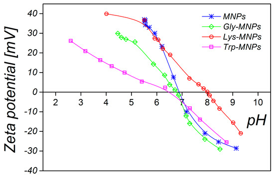 In addition, zeta potential measurement as a function of pH has been performed to confirm the surface charge properties and the presence of AAs on the surface of MNPs. Figure 7 shows that the naked MNPs and AA–MNPs were positively charged at lower pH and negatively charged at higher pH. Moreover, the isoelectric point (IEP) of the MNPs increased from pH 6.9 to 8.0 with Lys; in the case of Gly and Trp, IEP slightly shifted towards lower IEP values 6.4 and 6.6. The behaviour is in agreement with the assumption that the more AA molecules adsorbed, the more the IEP moves from the IEP of the MNPs toward the IEP of the pure AAs [32].
