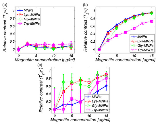 The relaxation time values from the maps in Figure 9 are quantitatively shown in Figure 10. Theoretically, IONPs should shorten both the longitudinal and transversal relaxation times [33]. Figure 10, in general, confirms this theoretical assumption by decreasing both the relaxation values with an increase in IONPs concentration, although we can see a few exceptions. For the lowest concentration of IONPs (2.5 μg/mL), the increase in longitudinal relaxation time (T1) was observed for all MNP complexes (Figure 10a). This is a typical feature of positive contrast agents observed under specific conditions, but also in negative contrast agents, including IONPs [33]. The specific conditions involve the size and concentration of IONPs [34]. However, surprisingly, the increase in the relaxation time T2* value for the Trp- and Gly-MNP complex was also observed, which again was only for the lowest IONPs concentration (Figure 10c). The reason for this remains unclear.