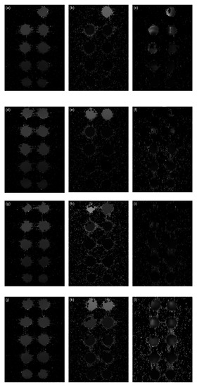 Relaxation time maps of the AA–MNP complexes. (a) MNPs T1 map, (b) MNPs T2 map, (c) MNPs T2* map, (d) Lys-MNPs T1 map, (e) Lys-MNPs T2 map, (f) Lys-MNPs T2* map, (g) Gly-MNPs T1 map, (h) Gly -MNPs T2 map, (i) Gly -MNPs T2* map, (j) Trp-MNPs T1 map, (k) Trp -MNPs T2 map, (l) Trp -MNPs T2* map.