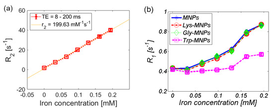 To investigate the relaxivity properties of AA–MNP complexes, we measured and analysed the concentration gradient (2.5, 5, 7.5, 10, 12.5, 15, 17.5, and 20 μg/mL) of each sample: MNPs, Lys-, Gly-, and Trp-MNPs.