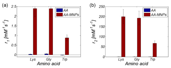 As seen already in the RC comparison (Figure 8), the Trp-MNP complex exhibited significantly different values in comparison with the other complexes, regardless of AA coating. The calculated relaxivity values of the studied AA–MNP complexes are shown in Table 3 and graphically in Figure 12.