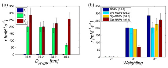 For comparative purposes, we also provide the plots with a relaxivity comparison of all AA–MNP complexes, where Figure 15a shows the relaxivity depending on the hydrodynamic diameter, while Figure 15b shows the relaxivity depending on the weighting. Both figures prove the dominant T2 relaxation mechanism in AA–MNP complexes, as well as pointing to the opposite mechanism of relaxation action at r1 and r2 on one side, and r2* on the other side.