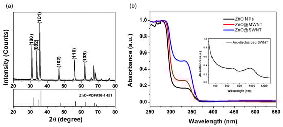(a) XRD patterns of the ZnO NPs and (b) UV–Vis absorption spectra of ZnO NPs, ZnO@MWNT, and ZnO@SWNT. Inset shows the UV–Vis absorption spectrum of pure A-SWNT.