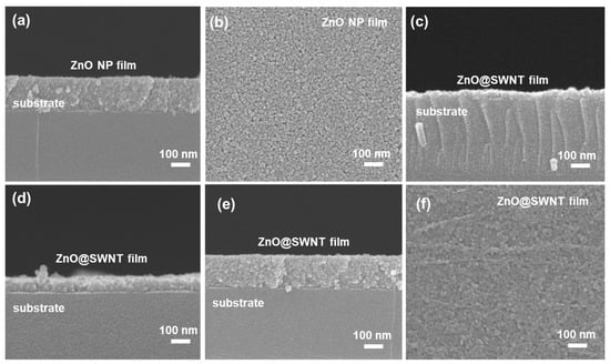(a) Cross-sectional and (b) top-view SEM images of the ZnO NP film, (c–e) cross-sectional SEM images of ZnO@SWNT films spin-coated 1, 3, and 5 times, respectively, and (f) top-view of SEM image of the ZnO@SWNT film. The thickness of ZnO film (7 times of spin coating in Figure 3a) and ZnO@SWNT (5 times of spin coating in Figure 3e) were same as 165 nm.