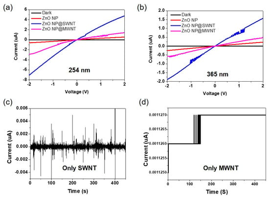 I–V curves of three different UV sensors (ZnO NPs, ZnO NP@SWNT, and ZnO NP@MWNT) under different wavelength UV irradiation (a) 254nm and (b) 365nm (1.25 mW/cm2), and photoresponse of UV sensors made of (c) only A-SWNT and (d) MWNT.