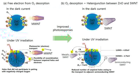 The enhanced sensitivity in the presence of SWNTs can be explained by the different photocurrent mechanisms for MWNTs and SWNTs in the ZnO-based UV sensor. As shown in Figure 6, the photocurrent for ZnO@MWNT is mainly governed by the oxygen desorption mechanism under the UV irradiation, which induces the hole depletion, thus generating free electrons (Figure 6a). The free electrons generated in this process can move between two electrodes under the applied bias [,,]. In this mechanism, the presence of MWNTs, which are metallic, simply provides pathways for the free electrons to move from ZnO to Ag electrode, thus facilitating electron transport along the MWNTs. However, there are still some holes which did not participate in pairing with negatively-charged oxygen remained in ZnO NPs. Possibly, these remained holes can recombine with electrons, resulting in the decrease in photocurrent. On the other hand, in the case of ZnO@SWNT, of which SWNTs have both metallic and semiconducting characters with band gaps, the holes generated under the UV light are partially trapped with charged oxygen, and free electrons are extracted mainly through the metallic SWNTs (~33%) under the applied voltage bias between two electrodes as in the case of ZnO@MWNT (Figure 6b). At the same time, the remained holes which did not pair with charged oxygen can be additionally extracted toward adjacent p-type semiconducting SWNT (~66%), of which HOMO level exists above valence band of ZnO [,,,]. This additional hole extraction prevents the recombination between holes and electrons, which is considered as a main factor that significantly enhances the sensitivity of ZnO@SWNT over that of ZnO@MWNT. From our separate measurements for another control sample (bare SWNTs or MWNTs without ZnO), there was no photoresponse for UV light (Figure 5c,d). This was because CNTs cannot produce photocurrent by itself because free electron cannot be generated even if CNTs themselves absorb the light in the UV region []. Although the mechanism of free electrons based on oxygen desorption under the UV light has been dominantly considered for most of the ZnO-based UV sensors with a lateral geometry (in-plane) of electrode terminals [], the performance improvement in our hybrid ZnO@SWNT film can be attributed to the combination of two different mechanisms (i.e., electron transport through metallic SWNT and hole extraction toward semiconducting SWNT as shown in Figure 6b).