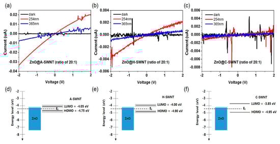 I–V curves for (a) ZnO@A-SWNT, (b) ZnO@H-SWNT, and (c) ZnO@C-SWNT(ZnO/SWNT = 20:1, w/w) under 254 and 365 nm UV light illumination (0.47 mW/cm2). Energy band diagram of (d) ZnO@A-SWNT, (e) ZnO@H-SWNT, and (f) ZnO@C-SWNT.