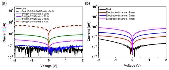 Figure 9 displays the I–V characteristics under the effect of the concentration of A-SWNTs in ZnO@A-SWNT (Figure 9a) and electrode distance (Figure 9b). The sensitivity generally increased with the increase in the concentration of A-SWNTs (Figure 9a). This is because of the increased number of electron–hole pairs at the p-n heterojunction and more A-SWNT pathways for the photogenerated electrons with the increase in A-SWNTs. However, the excessive A-SWNTs mixed with ZnO NPs adversely affected the sensitivity because of the poor dispersion of A-SWNTs in the ZnO/A-SWNT solution, which induced the aggregated domains on the film after spin coating (Figure 9a). This behavior was commonly observed regardless of the types of SWNTs (Figure S3 (solution) and Figure S4 (film)). The sensitivity was maximized only at the optimum mass ratio between ZnO NPs and SWNTs (Figure 9a). The reduction in electrode gap increased the sensitivity because of the reduced pathway on which the photocarriers travel under the 254 nm UV irradiation (Figure 9b).