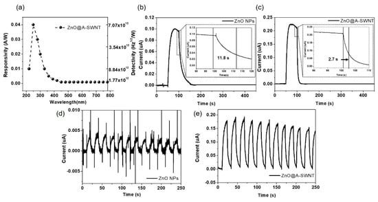 Finally, photoresponse for the ZnO@A-SWNT UV sensor was measured to investigate the photocarrier interaction between ZnO NPs and A-SWNTs. Figure 10a shows the spectral photoresponsivity (left y-axis) and detectivity (right y-axis) as a function of light wavelength for the ZnO@A-SWNT UV PD under the bias of 10 V. The responsivity (R) and detectivity can be calculated based on the following equation,