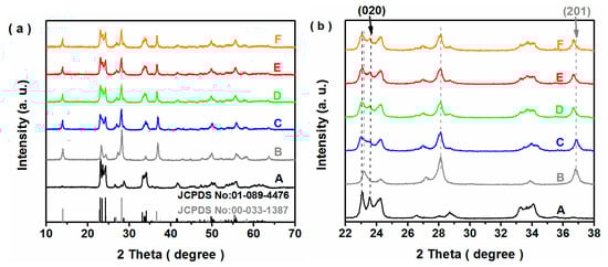 XRD patterns (a) and locally enlarged XRD patterns (b) of the m−WO3 (A), h−WO3 (B), h/m−WO3 (C), 1.0Fe−h/m−WO3 (D), 1.25Fe−h/m−WO3 (E) and 1.5Fe−h/m−WO3 (F) samples.