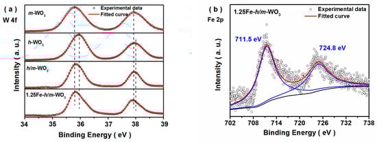 The surface compositions of the as−prepared samples were investigated by XPS measurement. As shown in Figure 3, the high-resolution XPS spectra for W 4f and Fe 2p were deconvoluted by the Gaussian−Lorenzian method. Two evident peaks observed for m−WO3 at the binding energies of 37.9 and 35.8 eV were assigned to W 4f5/2 and W 4f7/2, respectively, which were in accordance with the reported results of monoclinic WO3 [31]. The peaks at 38.0 and 36.0 eV corresponded to the characteristic peaks of W(VI) in hexagonal phase WO3 [32,33]. In h/m−WO3 and 1.25Fe−h/m−WO3 samples, the characteristic peaks of W(VI) for monoclinic and hexagonal phase were discovered in the m−WO3 and h−WO3, respectively [32,34]. Besides, it was observed that W(VI) 4f7/2 and W(V) 4f5/2 peaks of m−WO3 and h−WO3 shifted slightly compared with those of h/m−WO3 and 1.25Fe−h/m−WO3, which were caused by the formation of phase junctions and Fe-doping [6,15]. In the high-resolution Fe 2p spectrum (Figure 3b), the deconvolution peaks were resolved into four components. In particular, two distinct peaks at binding energies of 711.5 and 724.8 eV corresponded to the characteristic peaks of Fe(III) for 2p3/2 and 2p1/2, respectively [35]. Combined with the XRD results, Fe impurity was shown to be successfully doped into the h/m−WO3 phase junction.