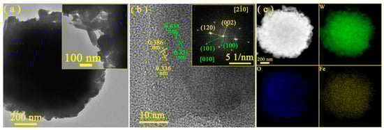 TEM images (a,b) and EDX mapping (c) of the 1.25Fe−h/m−WO3 sample.