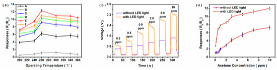 The sensing properties of WO3−based sensors were obviously dependent on the operating temperature. As shown in Figure 5a, all the prepared sensors reached maximum responses at 260 °C to 10 ppm acetone. In particular, 1.25Fe−h/m−WO3 exhibited the optimal response, which was attributed to the formation of phase junction and Fe doping. Moreover, the sensing response of 1.25Fe−h/m−WO3 to different concentrations of acetone were measured at 260 °C at a low RH atmosphere (<20% RH). As shown in Figure S3, there were sudden rises and declines of the voltage values when acetone gas was added and discharged, respectively, which indicated that 1.25Fe−h/m−WO3 possessed fast response/recovery speed towards acetone molecules. Particularly, the response of 1.25Fe−h/m−WO3 to acetone was linear from 0.1 to 1 ppm, which was not suitable for detection of the relatively high concentration of acetone for exhaled breath analysis under the humid condition. The response of WO3-based sensor to acetone was thus investigated in the concentration range of 0.2−10 ppm at 90% RH atmosphere. As shown in Figure S4, the responses to acetone decreased at 90% RH atmosphere, compared with those at a low RH atmosphere (<20% RH). Moreover, 1.25Fe−h/m−WO3 exhibited an enhanced response to acetone at 90% RH atmosphere under LED light illumination (Figure 5b,c), and the sensor required more time to establish dynamic balance because more energetic electrons were generated by the light energy. As shown in Figure S5, the response exhibited a linear relation with acetone concentration in the range of 0.5−2.5 ppm at 90% RH atmosphere. Additionally, the acetone-sensing properties of other sensors were also improved under LED light illumination (Figure S6). The results indicated that light irradiation improved the responses of Fe-doped h/m−WO3 gas sensor at high RH atmosphere. Hence, Fe-doped h/m−WO3 phase junction sensors could be used to screen type II diabetes by analysis of acetone in exhaled breath.